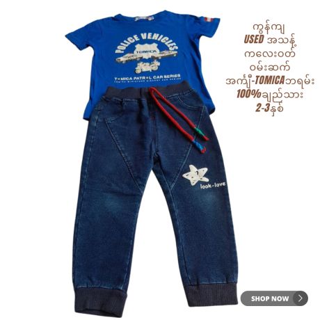ချည်သား ကလေးဝတ် ဝမ်းဆက် အင်္ကျီ Tomica ဘရမ်း+ ဂျင်းဘောင်းဘီရှည် 2-3 နှစ် အသန့် Used Preloved
